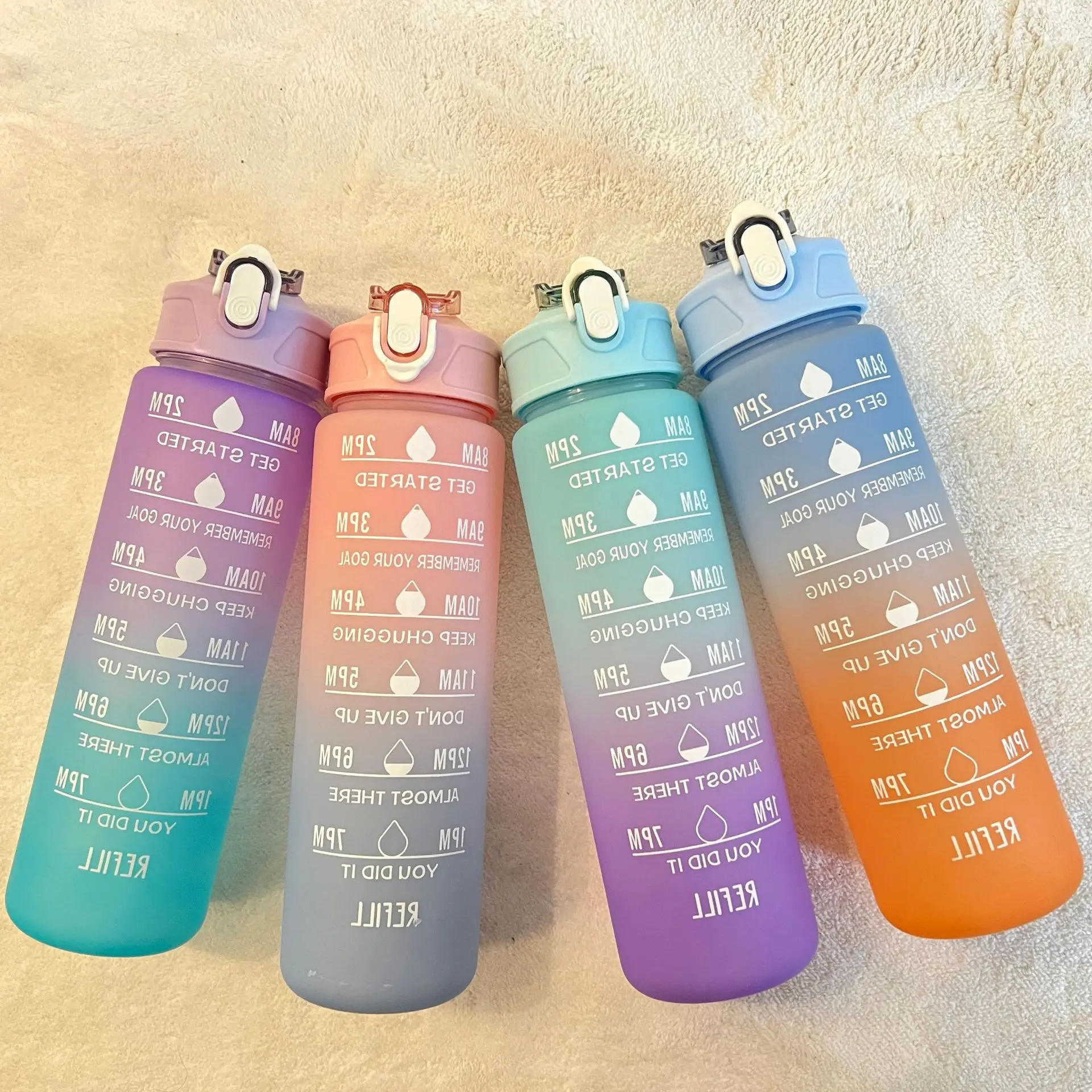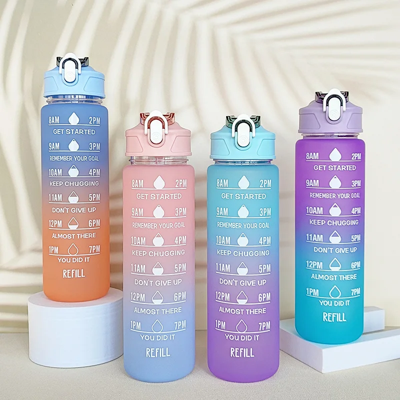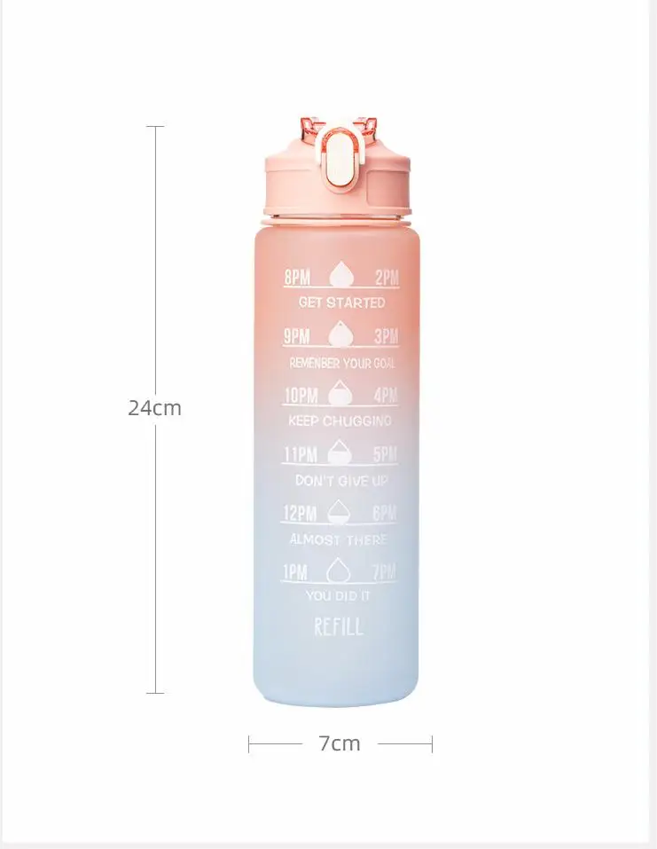 قارورة بسعة 900 مل، تحتوي على مؤشرات وقت تساعدك تتذكّر متى تشرب، وعبارات تحفيزية تخليك تلتزم بعادة الشرب اليومية.
